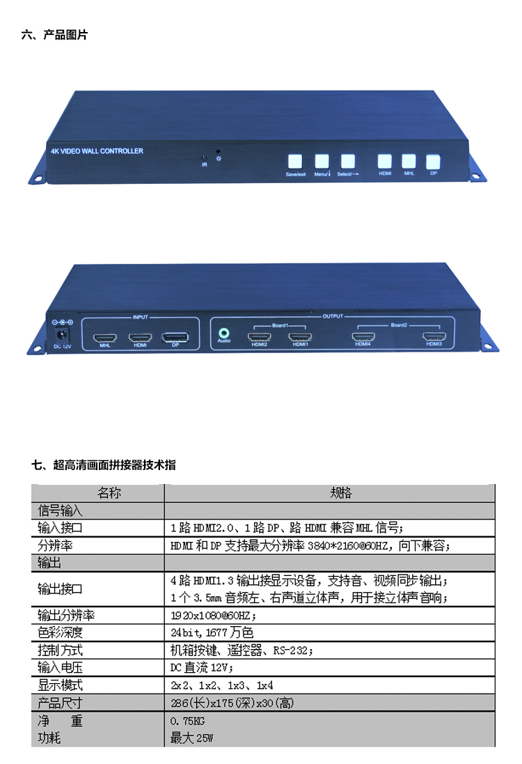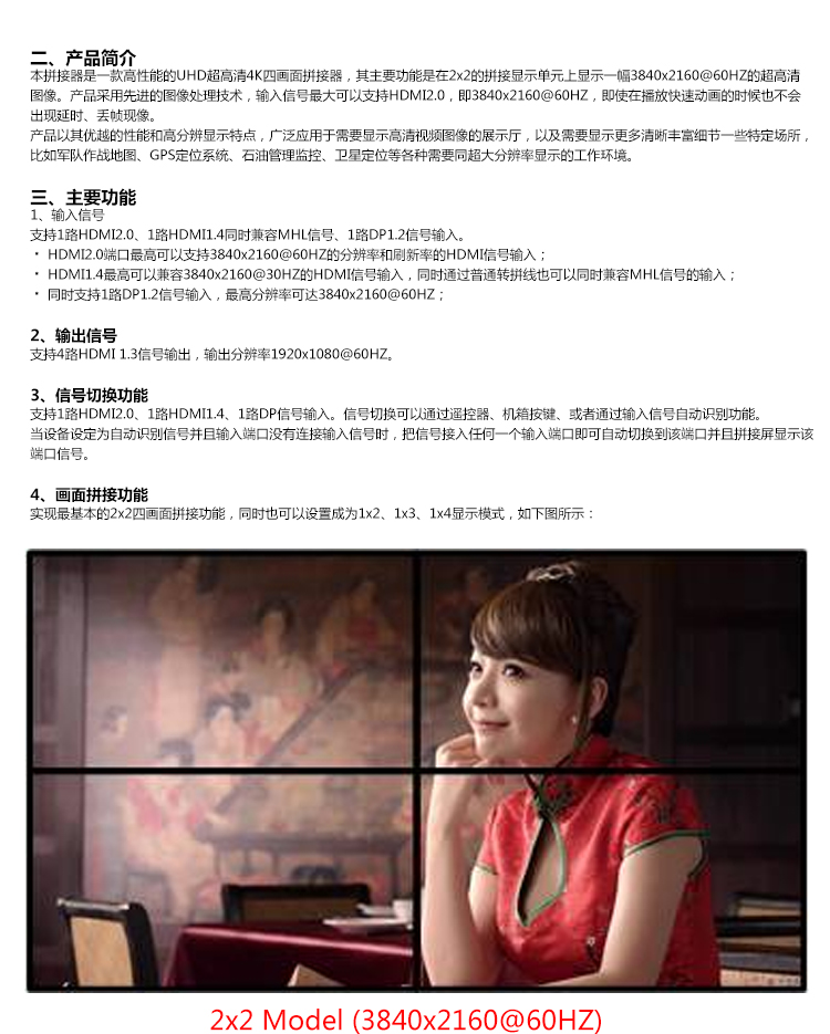 本產(chǎn)品是定制化的4K畫(huà)面拼接器,其主要功能是在M x N的拼接顯示單元上顯示一幅3840x2160@60HZ的超高清4K圖像。產(chǎn)品采用先進(jìn)的圖像處理技術(shù),輸入信號(hào)最大可以支持HDMI2.0,即3840x2160@60HZ,即使在播放快速動(dòng)畫(huà)的時(shí)候也不會(huì)出現(xiàn)延時(shí)、丟幀現(xiàn)像。